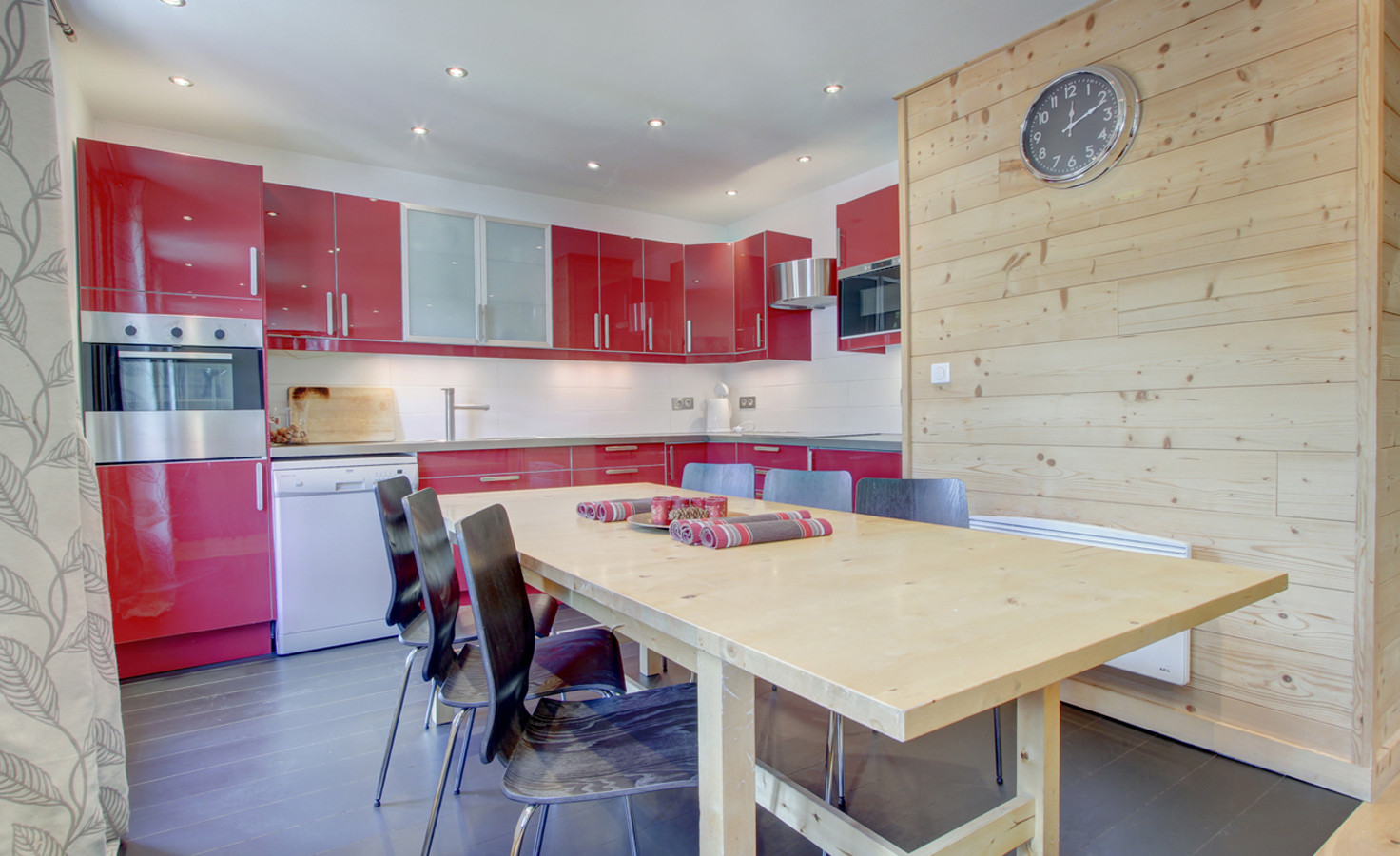 The dining table comfortably seats 8. The kitchen is fully equipped with an integrated fridge freezer, oven, induction hob, microwave, kettle, dishwasher and toaster, and plenty of workspace.