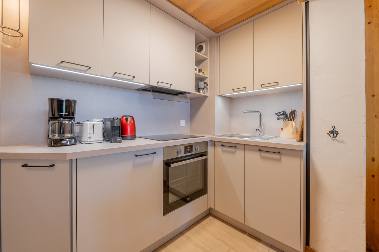 The kitchen is fully equipped with an integrated fridge freezer, oven, induction hob, microwave, kettle, Nespresso coffee machine, dishwasher and toaster, and plenty of workspace.