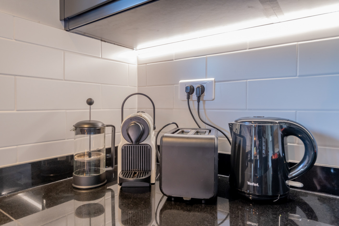 The kitchen is fully equipped with an integrated fridge freezer, oven, induction hob, microwave, kettle, Nespresso coffee machine, dishwasher and toaster, and plenty of workspace. There is also a washing machine available.